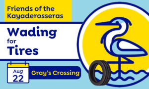 Volunteers welcome! Join us at Gray’s Crossing on August 22 as we wade into the creek to remove tires from the water. FoK has removed over 1000 tires in the past and we are ready to grab some more!